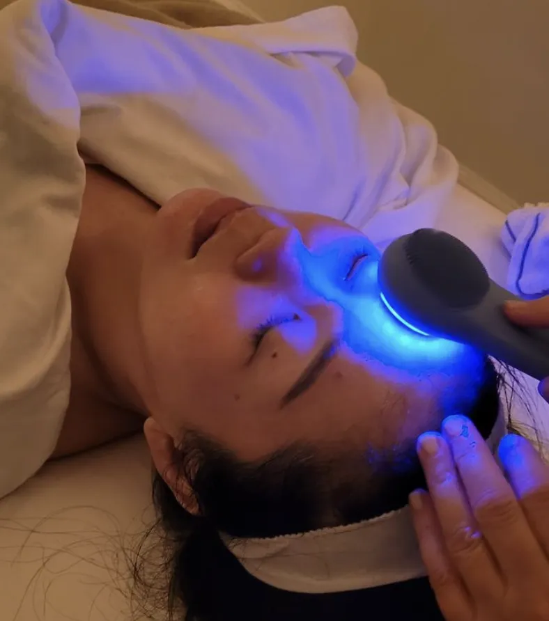 ✓ Kjølende fuktighetsmaske og massasje med blått LED-lys: En avkjølende maske full av fuktighet kombineres med blått LED-lys for å berolige huden og redusere rødhet.